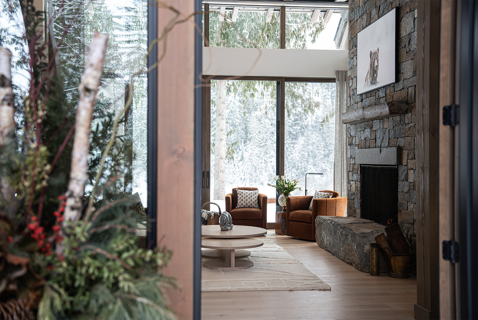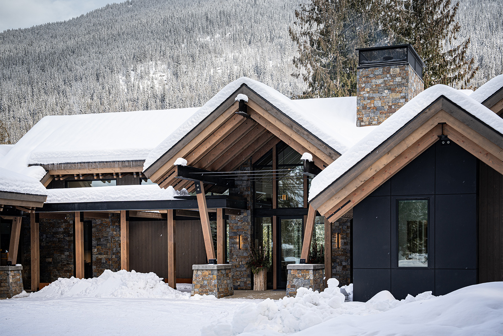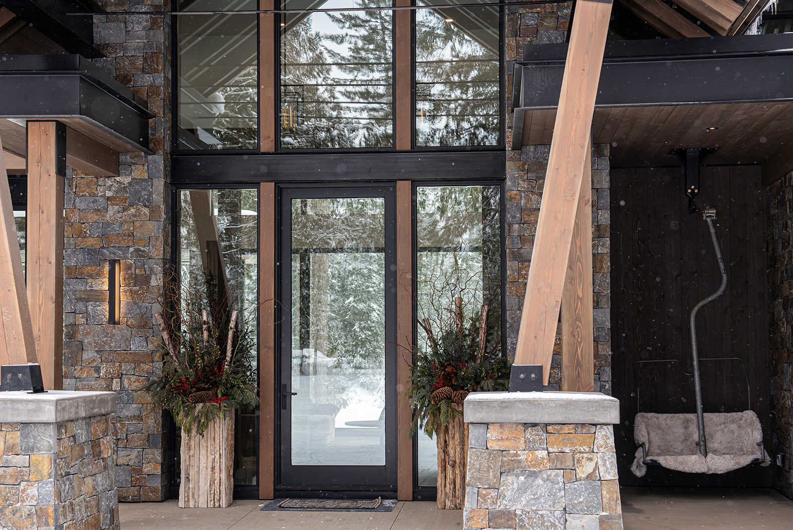 The exterior of the building features a combination of wood and stone work, complimenting its natural setting.